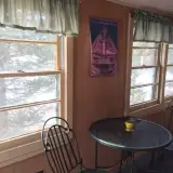 Screened porch with table and chairs facing the lake.