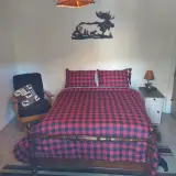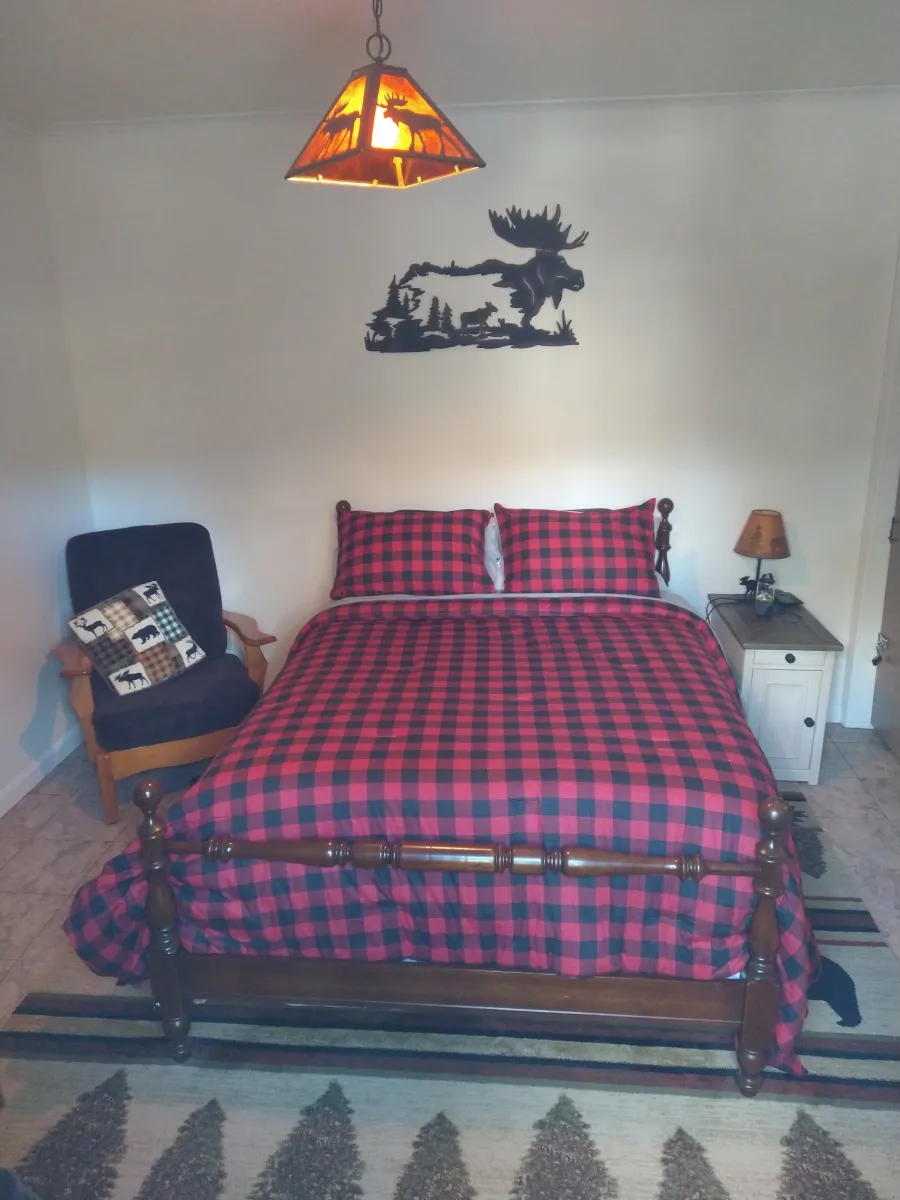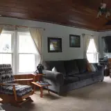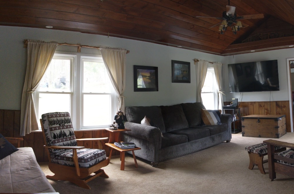 From the kitchen, you enter an open concept Great room which has a futon, queen sleeper sofa, and comfortable chairs to enjoy the 70" SMART television with Frontier Wi-Fi and DISH TV. Many books, magazines, maps and brochures on hiking, fishing, hunting, birdwatching, and awesome things to do in the Adirondacks can be found in the late 1800s hutch between the kitchen and Great room. Air conditioning is also provided.