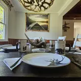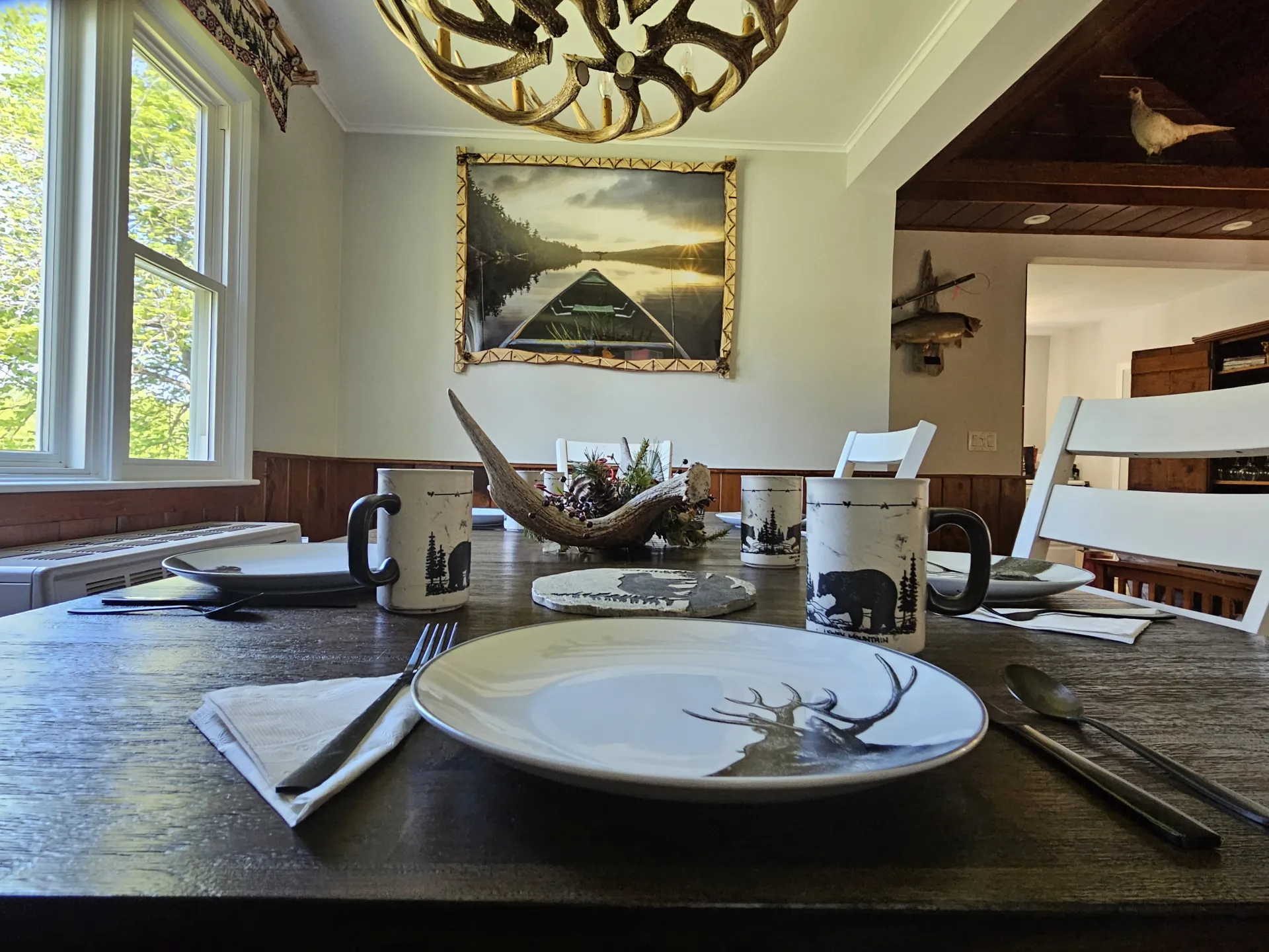 Farmhouse Table and Chairs, with Adirondack dishes and flatware