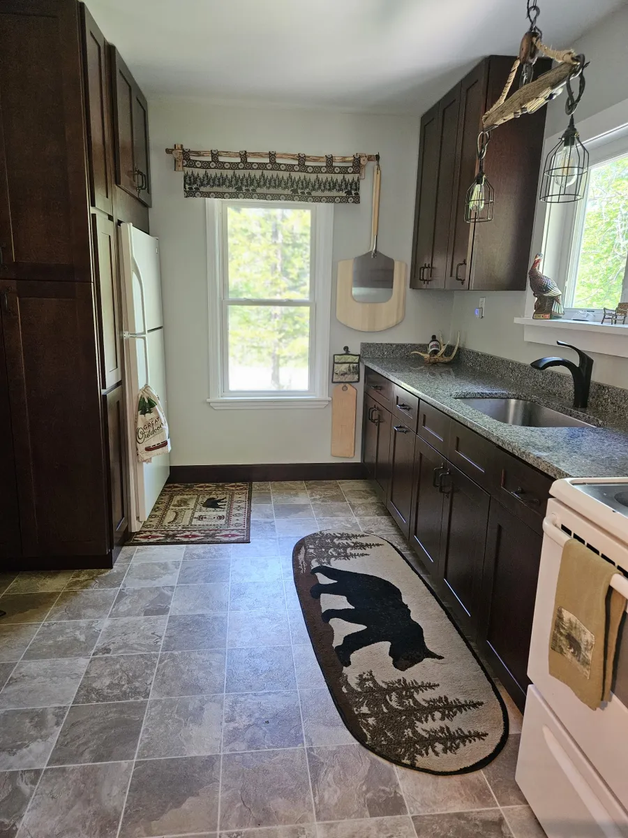When you enter the camp, you walk into the mud room which has a washer and dryer for your convenience. From there, you will enter a new kitchen, with an electric range, refrigerator, microwave, and numerous small appliances including a coffee maker and Keurig. This kitchen is equipped with many staples including sugar, flour and a great variety of spices. Feel free to help yourself to all items that are stocked in the pantry.
