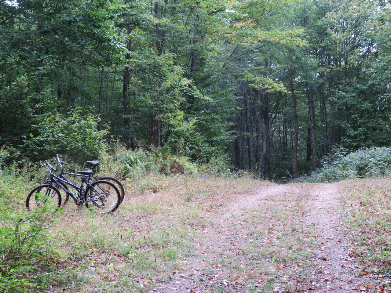 We continued our bike trip to the Mud Pond Mountain trailhead. The Cedarlands Boy Scouts named the peak "OA Mountain," and the wooden trail sign is marked "OA Trailhead." We parked our bikes and started the climb.