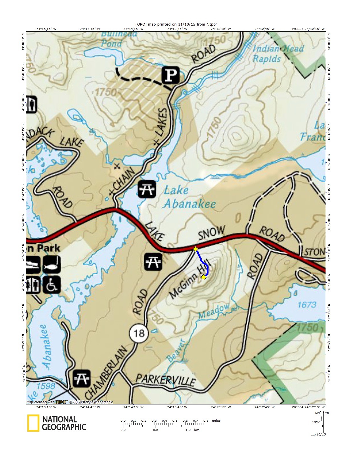 There were limited viewing opportunities from the summit. Not from a lack of looking, but even if there were some grandiose opening our view would still have been limited because the clouds had taken us in. The summit did have a cairn, survey disk and two other disks atop boulders pointing back to the high point of McGinn Hill. There were also a couple survey tie-down loops driven into the summit rock. They looked like something Verplanck Colvin would have used during his Adirondack survey back in the late 1800s. Once I got home I did a bit of research and learned that Colvin was on McGinn Hill back in 1896 doing a survey of the area. There must have been fewer trees back then. Colvin was also noted for burning or clearing summits to gain better a line-of-sight. Surely, he must have done that here, too.